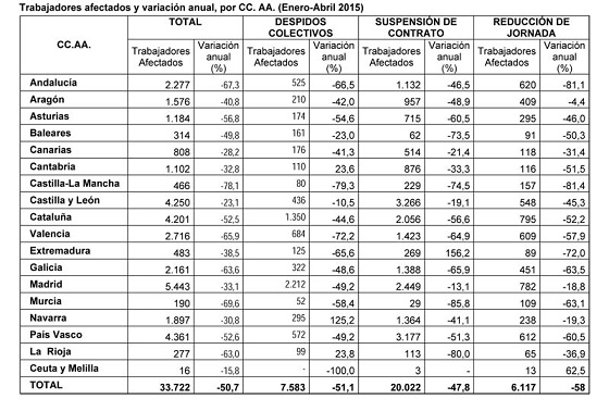 trabajadores afectados por regulaciones de empleo cae un 50,7% hasta