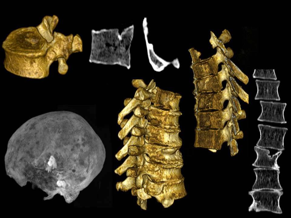 Imatges de diferents estudi TC en què s’adverteixen diferents patologies. S’aprecien fractures vertebrals i lesions lítiques cranials, igual que severs signes d’artrosi vertebral. En conjunt, la població analitzada, es va desenvolupar en un entorn físicament demandant i procliu als traumatismes.
